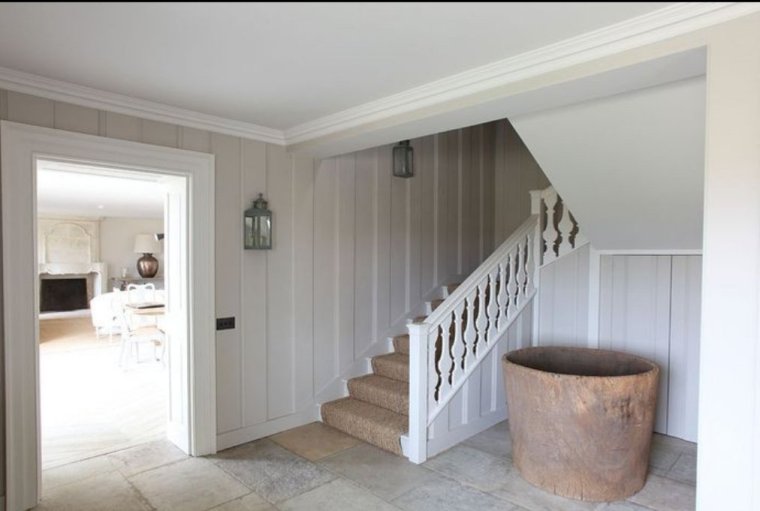 Simple broad-panelled perpendicular panelling, hung with lanterns, creates a calm and luxurious backdrop to all the knocks and bumps that a family hall and staircase take over the years. Occasional touching up and painting will be all that is required to keep this looking as fresh as the day it was decorated.