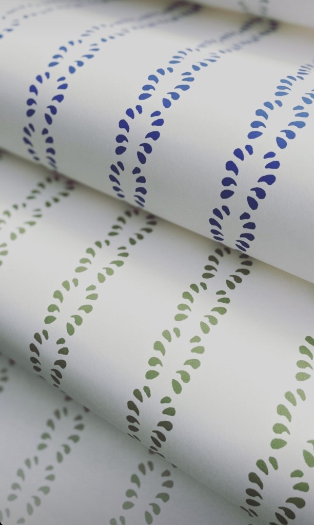 With its simple flowing small-scale design, it has the power to create a deceptively strong striped backdrop to a room. I love the soothing colourways of this undulating droplet design.