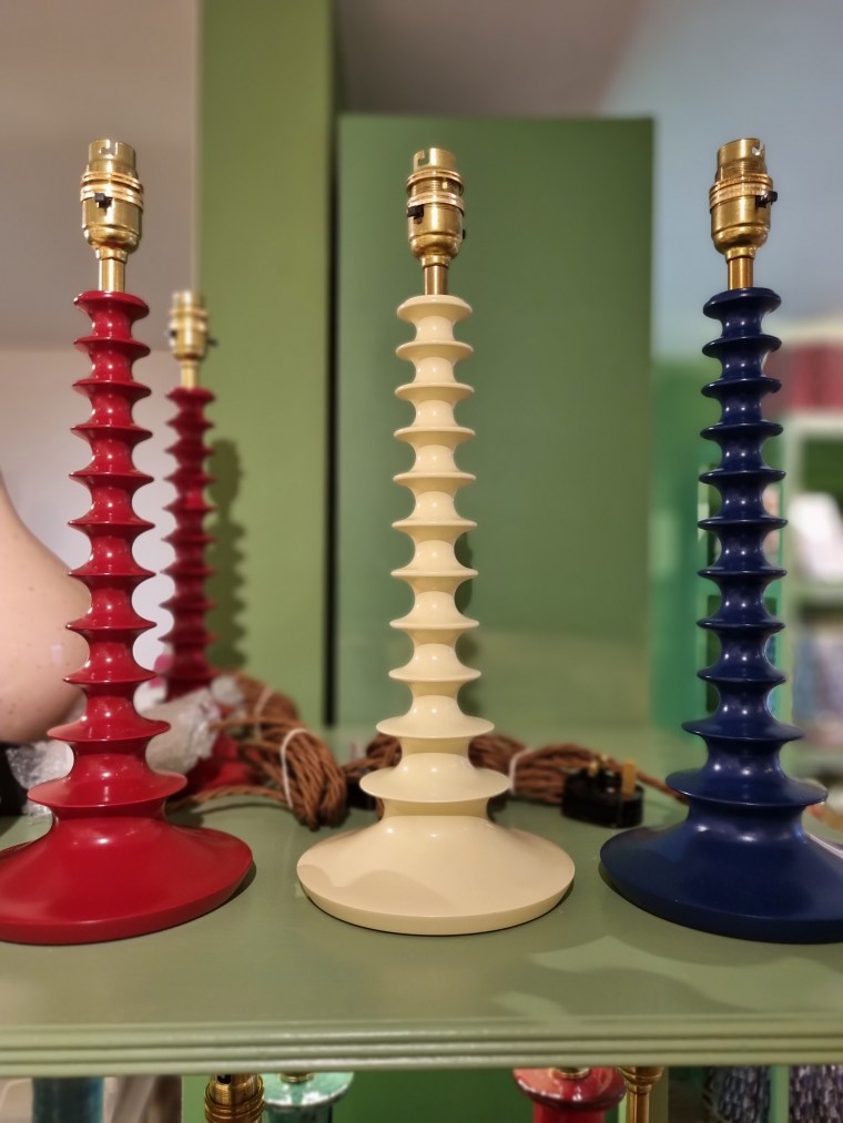 It’s all about the smart glossy profile with these wooden tiered lamps from Penny Morrison.