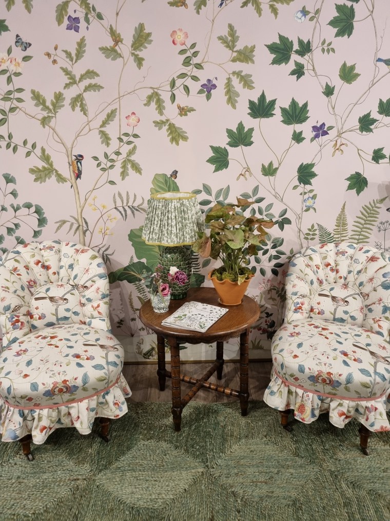 Sycamore and Oak is an enchanting tangle of foliage, flora and fauna in 3 m wallpaper panels. Seen here with fabric from the new Arboretum collection by Sanderson. Sweet garden room styling in the showroom from this collection with skirted upholstery combined with vintage furniture and textural green matting.