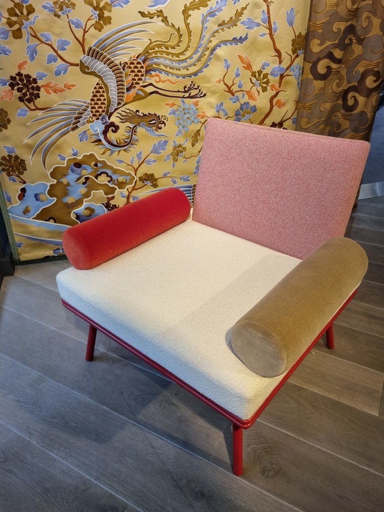 A Chinese silk design panel creates the backdrop to a Bauhaus-style chair upholstered in contrasting plain and textural fabrics. It made a very pleasing juxtaposition in the Lelievre showroom of new and old design.