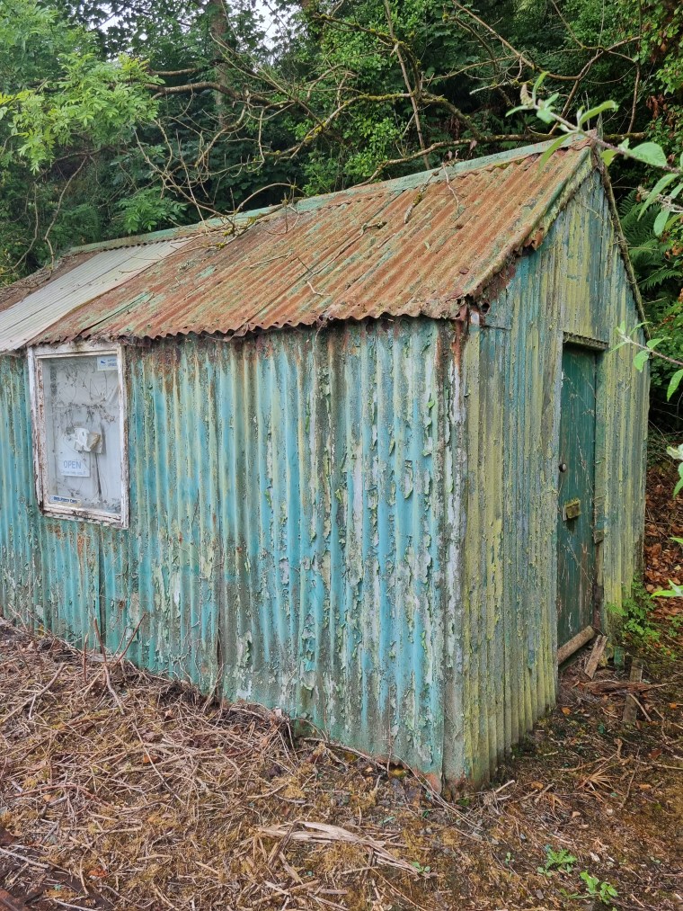 Shed? with front door … spotted in Pembrokeshire. A beauty of peeling turquoise and green corrugated iron. Photo: Charis