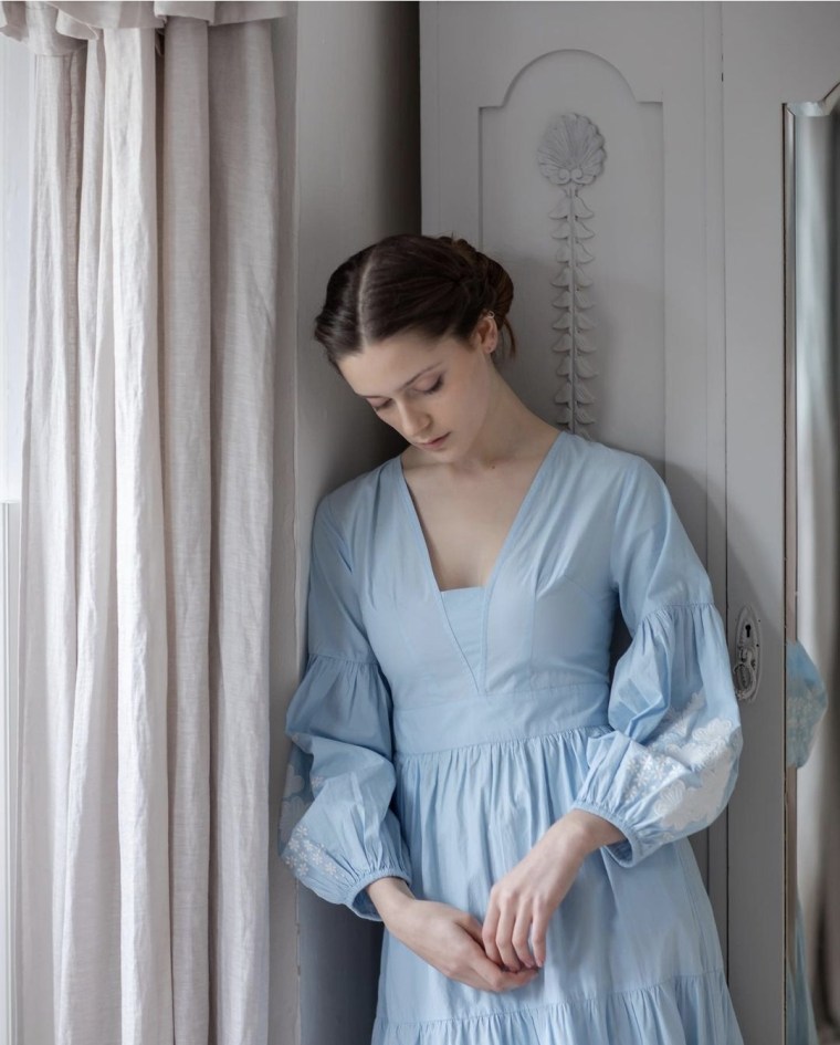 For fashion designer Ruth Eaton, it was about having grown up little more than a stone’s throw from London’s Portobello Road. “Many of my teenage Fridays and Saturdays were spent rummaging among the stalls of Portobello Market on the hunt for antique textiles. In those days, most sold for a song so when I became a university student on a tight budget, I dressed regularly (and shamelessly) in Victorian and Edwardian undergarments, from petticoats to camisoles to bloomers – not just because they were cheap but mainly because I loved the shapes, the crisp cotton (sometimes linen), the lace and the embroideries. Today, I recognise that those clothes have influenced the garments I create in details such as broderie anglaise, scalloped edges, tucks, pintucks and bishop and “leg o’ mutton” sleeves.”