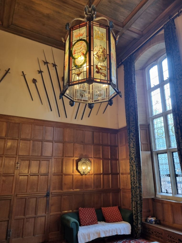 Large oak-panelled reception room at West Dean College with and arts and crafts lantern. Photo: Charis White