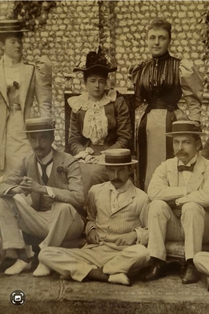 Guests at a summer party in the Edwardian era at West Dean manor house. I particularly loved the men’s elegant linen suits and summery white shoes. Taken from a picture hanging on the wall in the main house at West Dean. Photo: Charis White