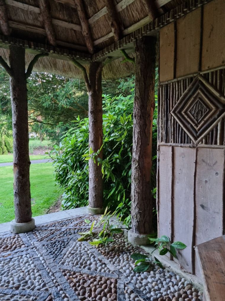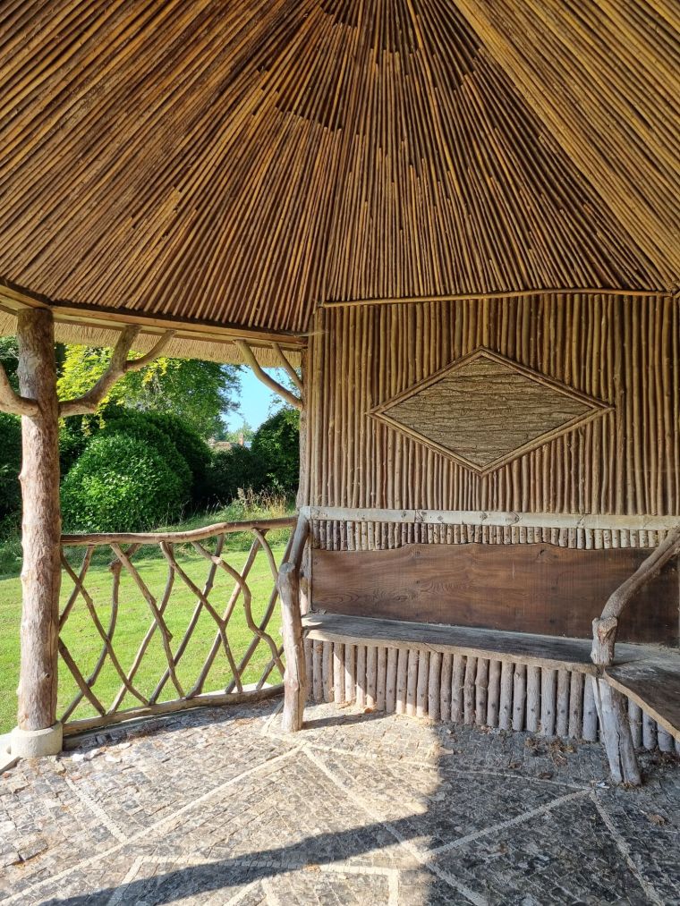 One of many shade-giving garden gazebos with the most exquisite hazel patterned panelling, pebble floor and thatch at West Dean College. Photo: Charis White