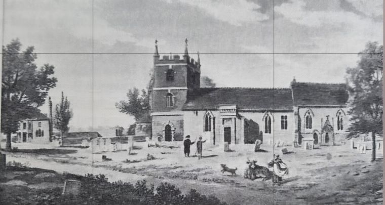 Print by Charles Tomkins, 1810 of St Bartholomew’s Church where you can see the Classical style porch. Interesting to see too the idea of how cattle roamed free, presumably from Church Farm next door. Image from ‘Basildon Berkshire, An Illustrated History’ written and published by Clive Williams OBE.