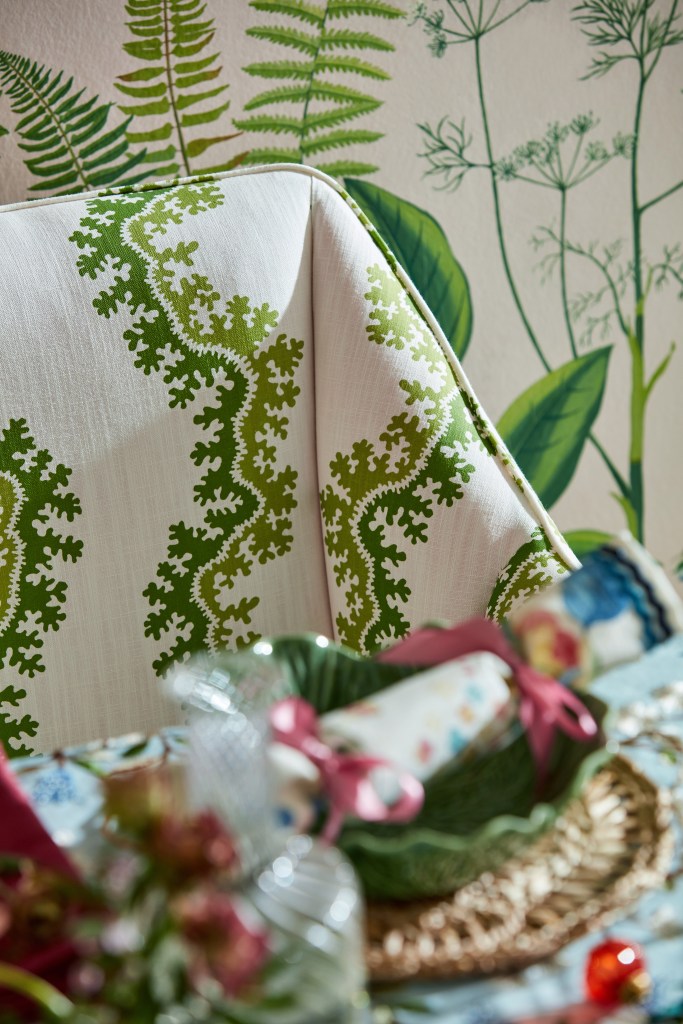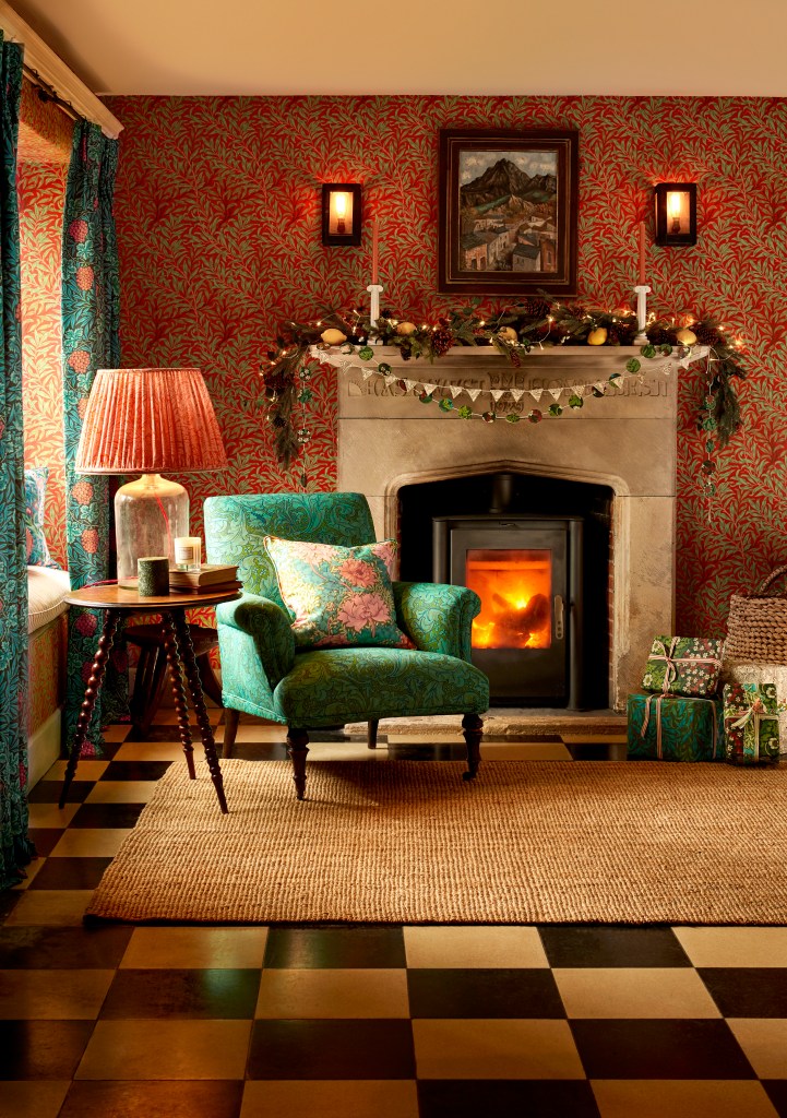 They certainly make a wonderful cosy backdrop for Christmas decorations as you can see in the Morris & Co living room image below. Lovely to note that antique bobbin furniture has taken on evergreen status in Morris & Co styling.