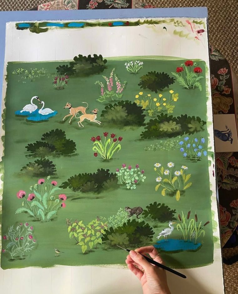 Some of the most recent eye-catching pattern designs are those based on an idealised version of nature and of historical medieval-inspired designs, such as this gorgeous new “Bucolic” wallpaper design by English designer, illustrator and ceramicist Polly Fern. It is completely delightful and wasn’t a surprise that it was also chosen by Hatta Byng, the Editor of House & Garden magazine, for her Editor’s letter page in the January 2025 issue.